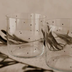 Das Trinkglas Set „Punkte“ von Eulenschnitt verleiht jeder Tafel eine spielerische Leichtigkeit. Die schlichten, aber charmanten schwarzen Punkte auf dem klaren Glas schaffen ein fröhliches Muster, das sich in jede Tischdekor integrieren lässt.“