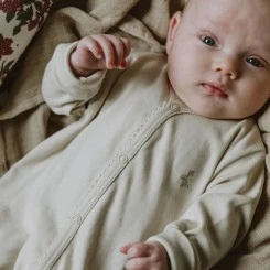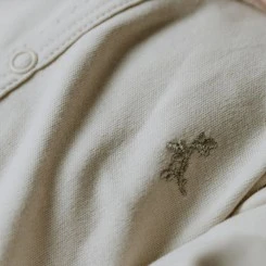 Ganz weicher Babystrampler Sand von Garbo & Friends mit feiner Stickerei auf der Brust. Der Strampler mit langen Armen und Beinen ist aus weichem Bio-Jersey, OEKO-TEX® 100 zertifiziert. Die Druckknöpfe zum Verschließen sind ohne Nickel gefertigt.