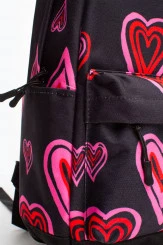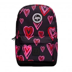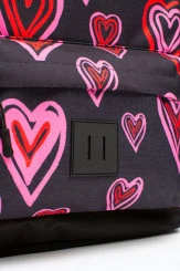 Süßer Rucksack Multi Hearts von Just Hype aus UK. Der Rucksack mit vielen Herzen, ist aus Polyester inklusive gesticktem Wappenlogo gefertigt und ist für größere Kinder ab 6 Jahren und Erwachsene geeignet. Er hat ein kleineres Vorderfach und ein großes Hauptfach, beides wird mit Reißverschluss verschlossen. Es passen DIN A4 Formate in den Rucksack, die Schultergurte sind verstellbar und breit genug, um einen gemütlichen Sitz am Rücken zu gewährleisten.