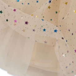Hübscher Ballerinarock FAIRY von Konges Slojd mit regenbogenfarbenen Sternen auf dem sandfarbenen Stoff. Der Rock hat mehrere Schichten und ist ein Rock, wie aus einem Märchen. Passt zu festlichen Anlässen genauso gut, wie in den Kindergarten.