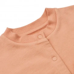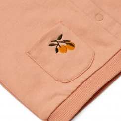 Schicker und gemütlicher Cardigan SILVIO Pale Tuscany von Liewood aus der Herbstkollektion 2023. Der Cardigan aus Bio-Baumwolle hat eine kleine Tasche auf der Vorderseite, auf die zwei Pfirsiche gestickt sind und wird mit Druckknöpfen verschlossen.